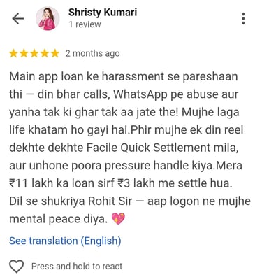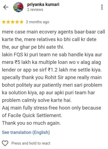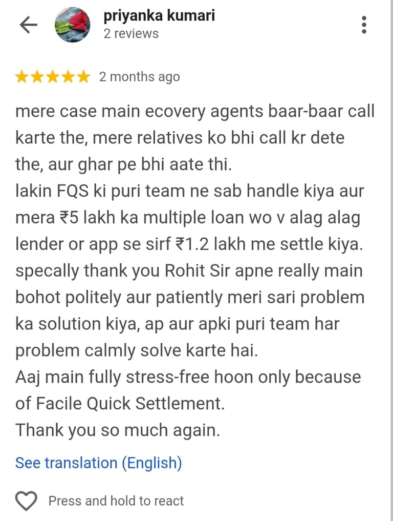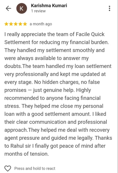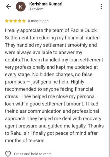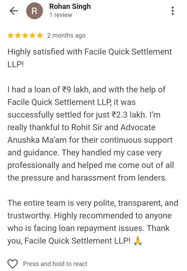 “Recovery agents were visiting my house and calling my office. After joining Facile, all calls stopped. They managed the settlement with the bank, and now I am debt-free. The team was polite, responsive, and effective.”
