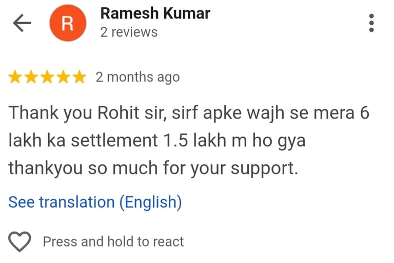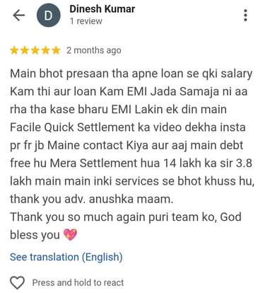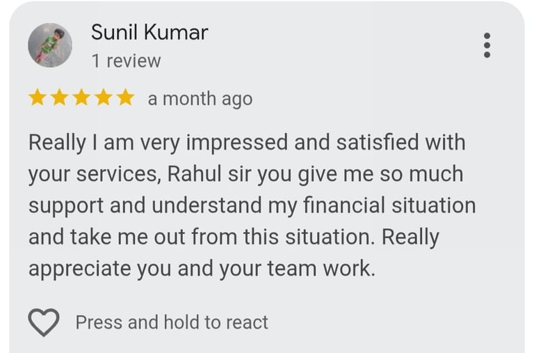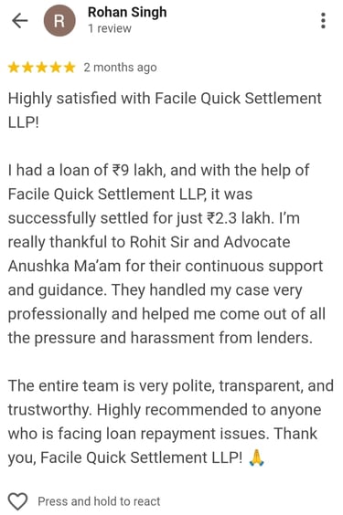“I had multiple personal loans and was getting default notices. These guys created a custom plan, saved my CIBIL from falling, and helped me settle everything without going to court. Great service, very affordable.”